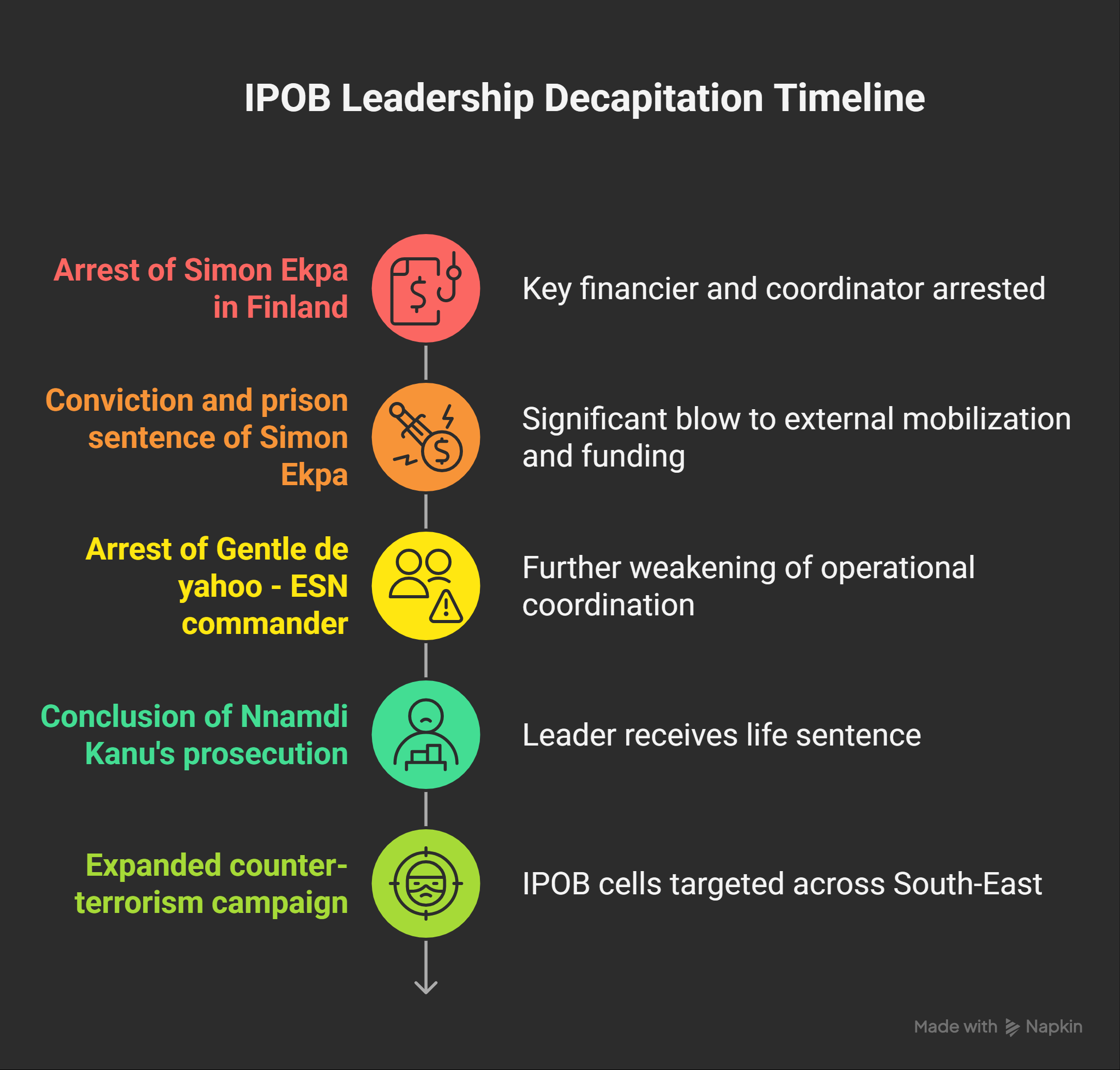 Argon Analytics assesses that IPOB’s retreat is primarily the result of systematic leadership decapitation, which fractured internal cohesion and disrupted command-and-control structures. The move may also reflect a positioning effort aimed at facilitating negotiations over the release of its leader, Nnamdi Kanu. A critical inflection point was the arrest of Simon Ekpa in Finland by Finnish authorities, where he was charged with inciting terrorism and promoting violence. As a key financier, external coordinator, and propaganda driver, Ekpa played a central role in sustaining enforcement of the sit-at-home order from abroad. His subsequent conviction and six-year prison sentence in 2025 significantly weakened the group’s external mobilisation and funding channels. Within weeks, Nigerian security agencies arrested a senior IPOB figure (Gentle de yahoo) and a commander of its armed wing, the Eastern Security Network, dealing a further blow to operational coordination and logistical supply lines. These developments were followed months later by the conclusion of Kanu’s prolonged prosecution, which ended in a life sentence. Taken together, this rapid succession of leadership losses marked a decisive degradation of IPOB’s organisational architecture and coincided with an expanded counter-terrorism campaign against its remaining cells across the South-East.