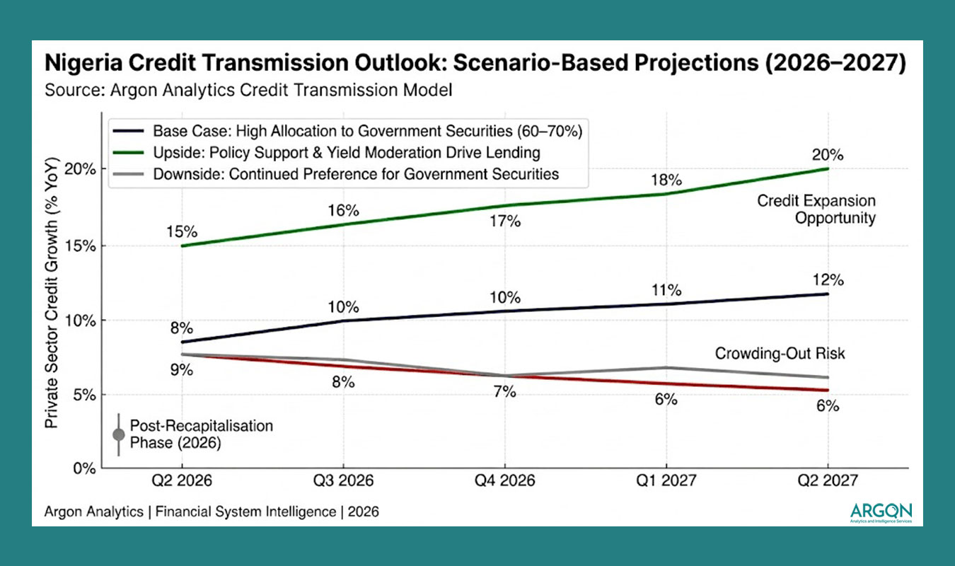 Argon Analytics credit transmission model, anchored on historical post-recapitalisation trends, suggests two plausible scenarios over the next 12–24 months. In a base case, where 60–70% of incremental balance sheet capacity remains allocated to government securities, private sector credit growth may remain muted at 8–12% annually, broadly in line with recent trends. In an upside scenario, where policy incentives and moderating yields shift allocation toward lending, credit growth could accelerate to 15–20%, with multiplier effects on manufacturing output and SME activity. Conversely, a downside scenario of continued crowding-out could see real credit growth stagnate in single digits, limiting macroeconomic impact despite stronger bank capitalization.