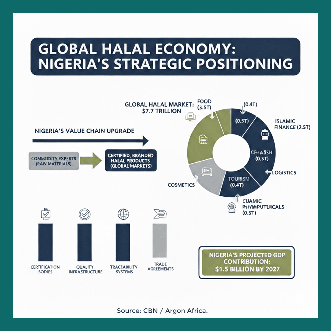 The economic logic is coherent. Halal certification has become a quasi-non-tariff trade passport that lowers entry barriers and supports premium pricing. Economies such as Malaysia and Brazil have leveraged halal standards as industrial policy tools, building certification institutions, export branding platforms, and supply-chain integration frameworks. Nigeria’s projection of adding around $1.5 billion to GDP by 2027 is modest in macroeconomic terms but strategically meaningful if it catalyses structural upgrading beyond hydrocarbons and raw agricultural exports.